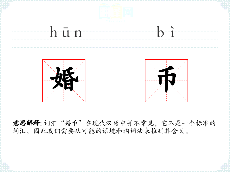 词汇“婚币”在现代汉语中并不常见,它不是一个标准的词汇,因此我们需要从可能的语境和构词法来推测其含义。