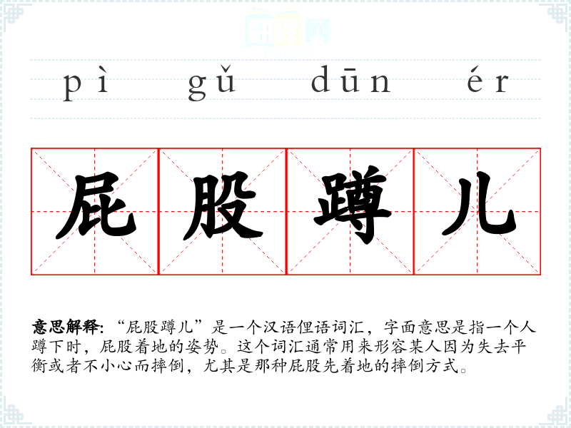“屁股蹲儿”是一个汉语俚语词汇,字面意思是指一个人蹲下时,屁股着地的姿势。这个词汇通常用来形容某人因为失去平衡或者不小心而摔倒,尤其是那种屁股先着地的摔倒方式。