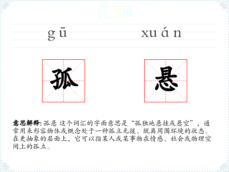 在英语中,类似的词汇可能是“isolated”或“suspended”,但“孤悬”特有的东方诗意和哲学意味在英文中较难找到完全对应的表达。