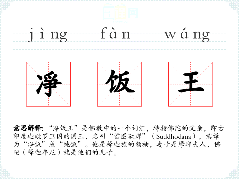 “凈饭王”这个词源于梵文“Suddhodana”,其中“Suddha”意为“纯净”,“odana”意为“饭”或“米”。在传播过程中,这个词随着文献的翻译而进入中文。
