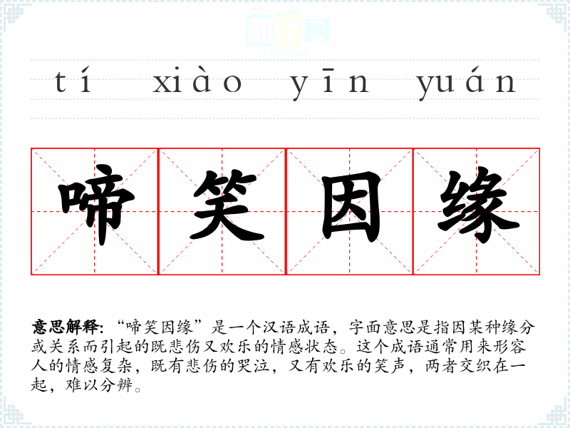 “啼笑因缘”是一个汉语成语,字面意思是指因某种缘分或关系而引起的既悲伤又欢乐的情感状态。这个成语通常用来形容人的情感复杂,既有悲伤的哭泣,又有欢乐的笑声,两者交织在一起,难以分辨。