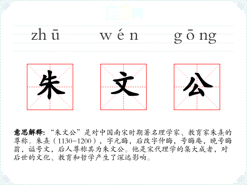 - 反义词:由于“朱文公”是对特定历史人物的尊称,通常不涉及反义词。