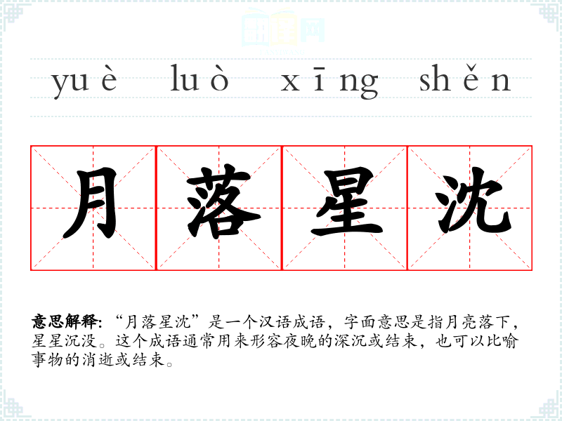 “月落星沈”是一个汉语成语,字面意思是指月亮落下,星星沉没。这个成语通常用来形容夜晚的深沉或结束,也可以比喻事物的消逝或结束。