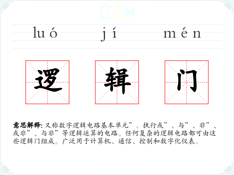 又称数字逻辑电路基本单元”。执行或”、与”、非”、或非”、与非”等逻辑运算的电路。任何复杂的逻辑电路都可由这些逻辑门组成。广泛用于计算机、通信、控制和数字化仪表。