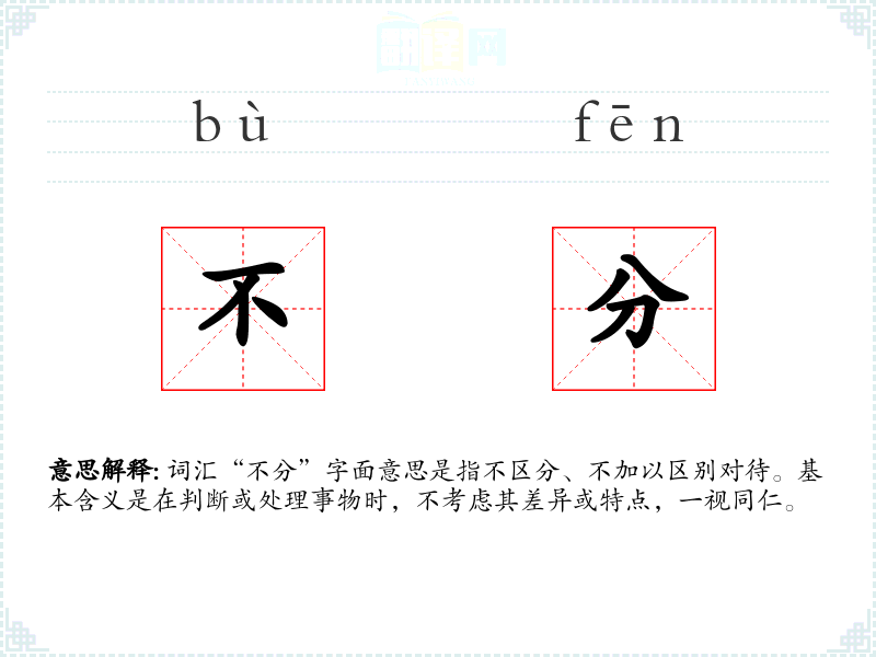 词汇“不分”字面意思是指不区分、不加以区别对待。基本含义是在判断或处理事物时,不考虑其差异或特点,一视同仁。