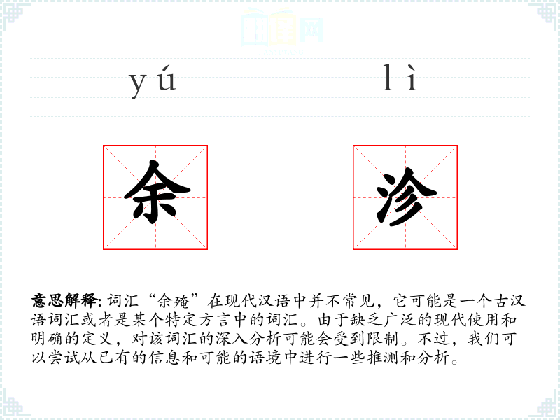由于“余殗”不是一个常见的现代汉语词汇,我们无法给出一个确切的基本定义。它可能是由“余”和“殗”两个字组成的复合词。在古汉语中,“余”可以表示“剩余”、“多余”或“我”的意思,而“殗”则较少见,可能与“淹”有关,表示“淹没”或“沉没”。