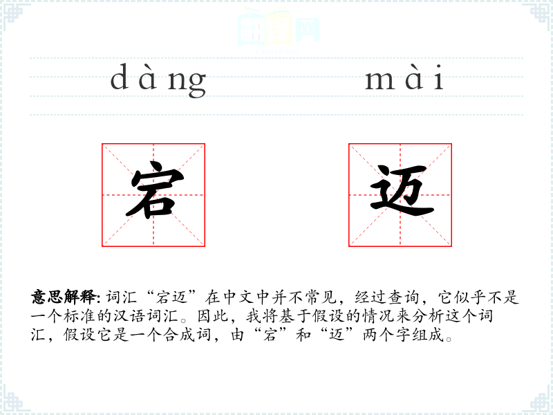 词汇“宕迈”在中文中并不常见,经过查询,它似乎不是一个标准的汉语词汇。因此,我将基于假设的情况来分析这个词汇,假设它是一个合成词,由“宕”和“迈”两个字组成。
