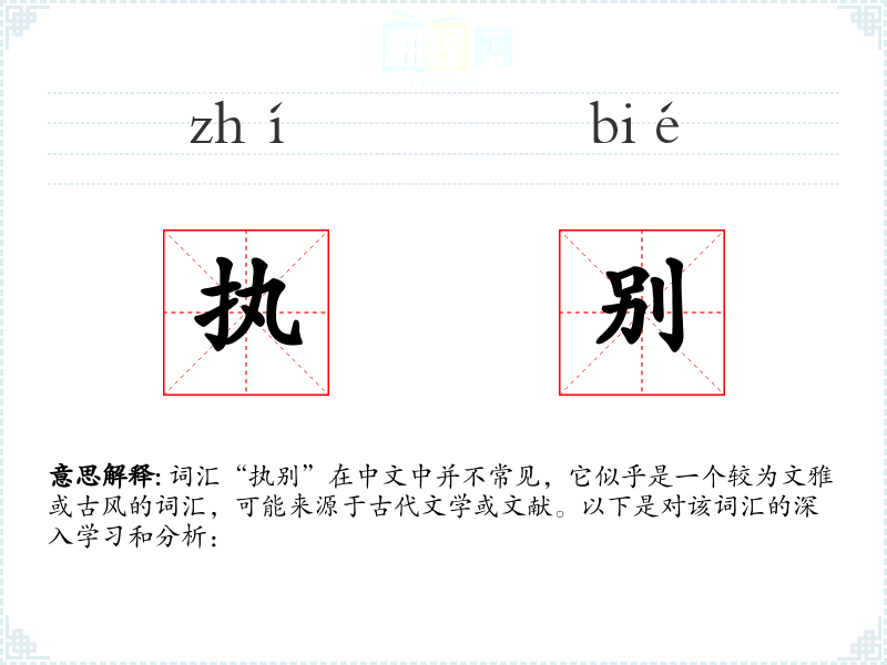 词汇“执别”在中文中并不常见,它似乎是一个较为文雅或古风的词汇,可能来源于古代文学或文献。以下是对该词汇的深入学*和分析: