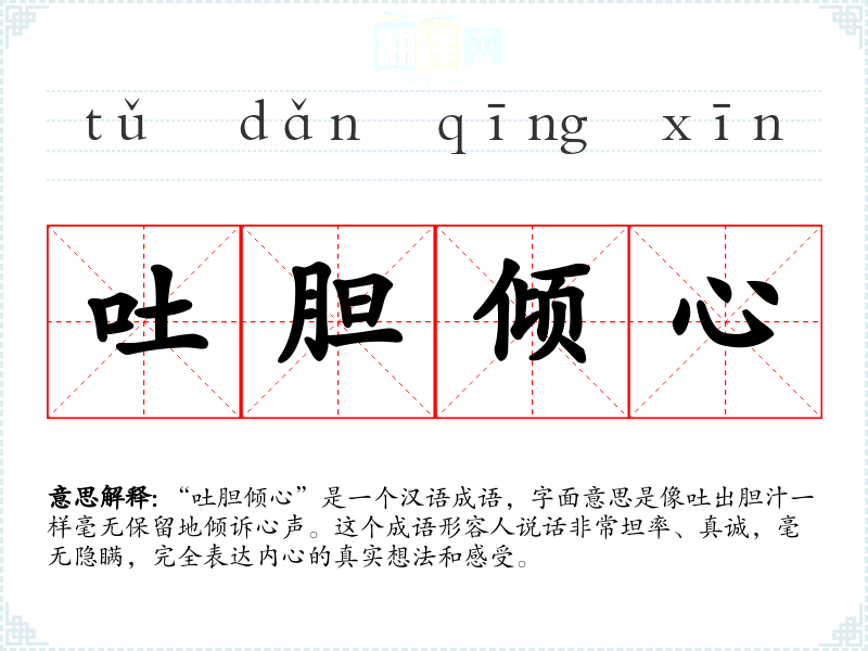 “吐胆倾心”是一个汉语成语,字面意思是像吐出胆汁一样毫无保留地倾诉心声。这个成语形容人说话非常坦率、真诚,毫无隐瞒,完全表达内心的真实想法和感受。