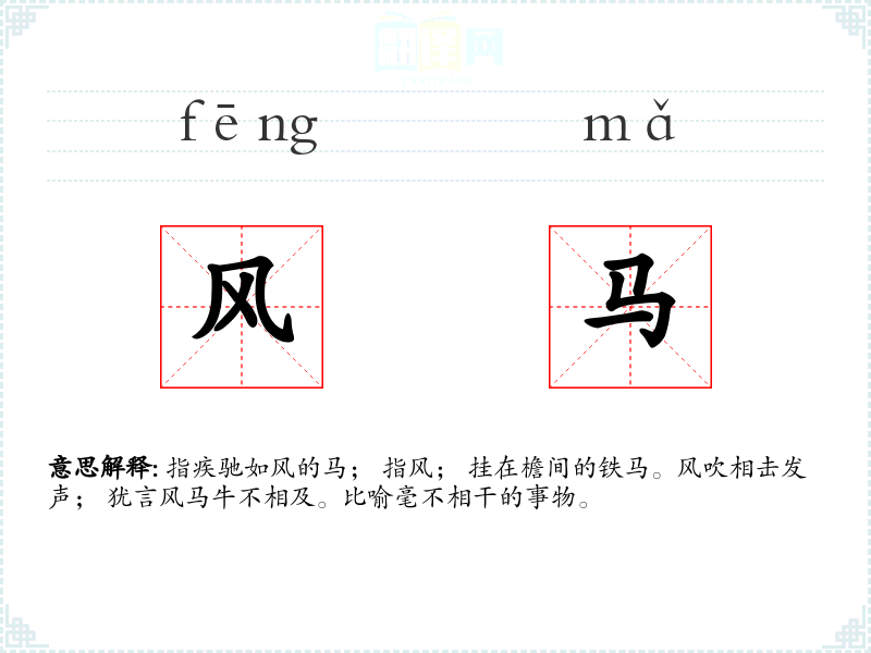 指疾驰如风的马; 指风; 挂在檐间的铁马。风吹相击发声; 犹言