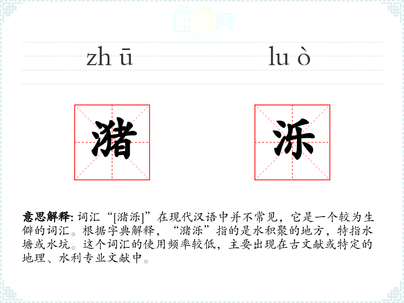 词汇“[潴泺]”在现代汉语中并不常见,它是一个较为生僻的词汇。根据字典解释,“潴泺”指的是水积聚的地方,特指水塘或水坑。这个词汇的使用频率较低,主要出现在古文献或特定的地理、水利专业文献中。