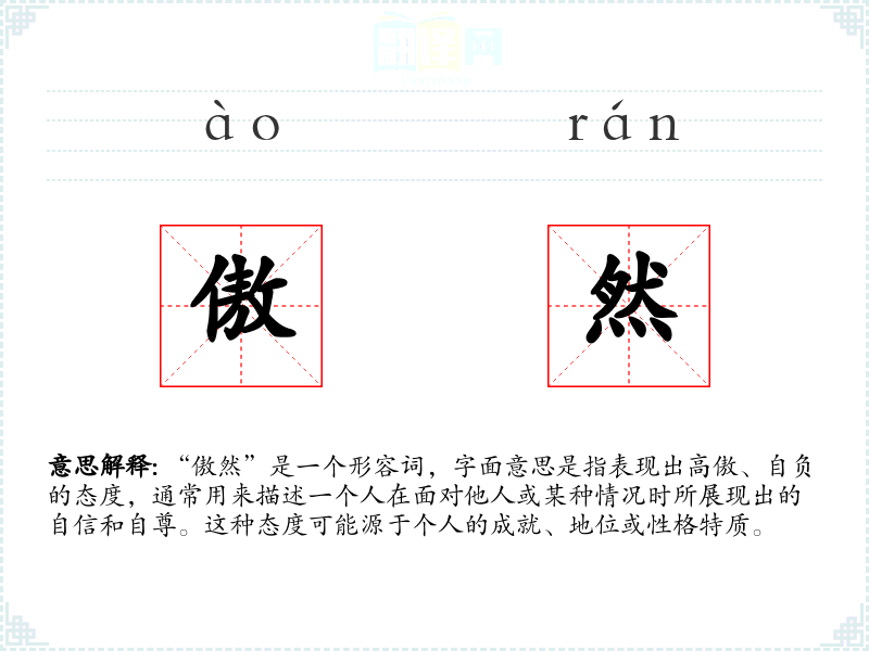 “傲然”是一个形容词,字面意思是指表现出高傲、自负的态度,通常用来描述一个人在面对他人或某种情况时所展现出的自信和自尊。这种态度可能源于个人的成就、地位或性格特质。