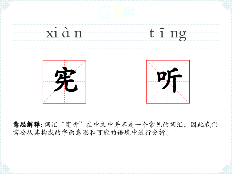 词汇“宪听”在中文中并不是一个常见的词汇,因此我们需要从其构成的字面意思和可能的语境中进行分析。