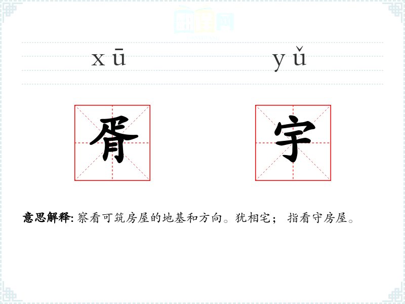 察看可筑房屋的地基和方向。犹相宅; 指看守房屋。