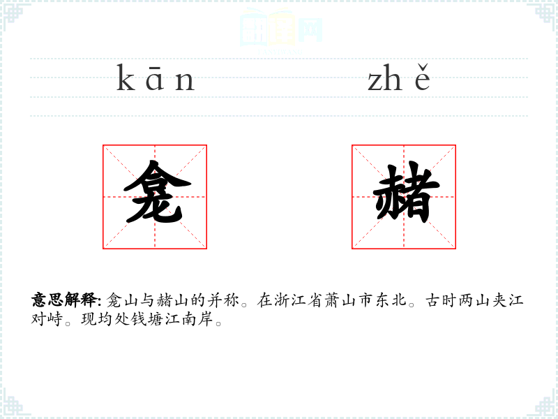 龛山与赭山的并称。在浙江省萧山市东北。古时两山夹江对峙。现均处钱塘江南岸。