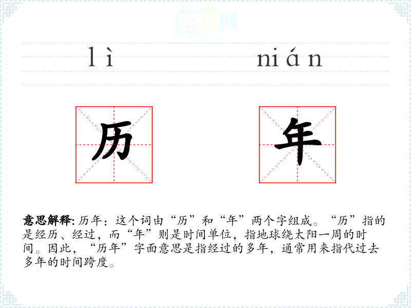 历年:这个词由“历”和“年”两个字组成。“历”指的是经历、经过,而“年”则是时间单位,指地球绕太阳一周的时间。因此,“历年”字面意思是指经过的多年,通常用来指代过去多年的时间跨度。