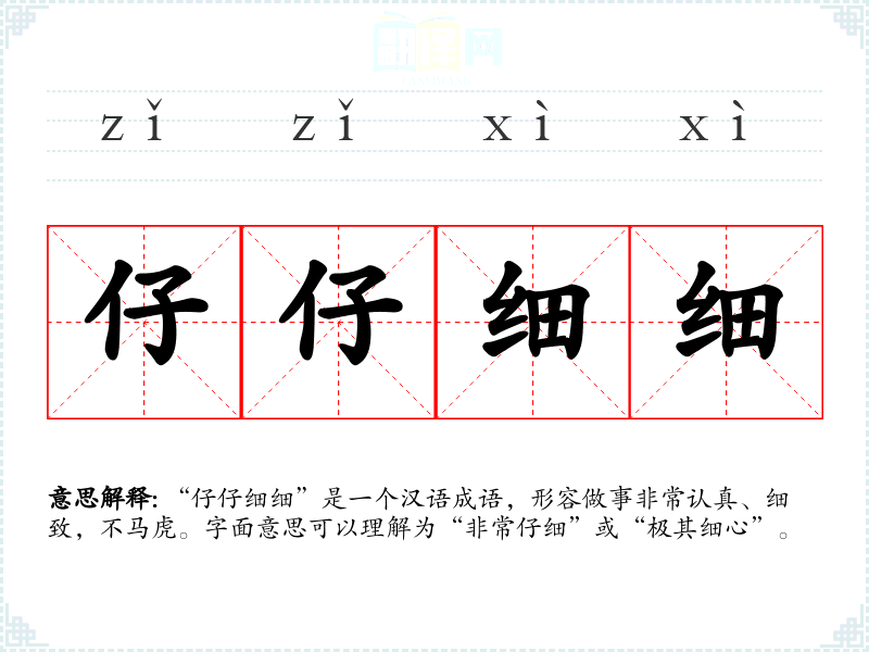 “仔仔细细”是一个汉语成语,形容做事非常认真、细致,不马虎。字面意思可以理解为“非常仔细”或“极其细心”。