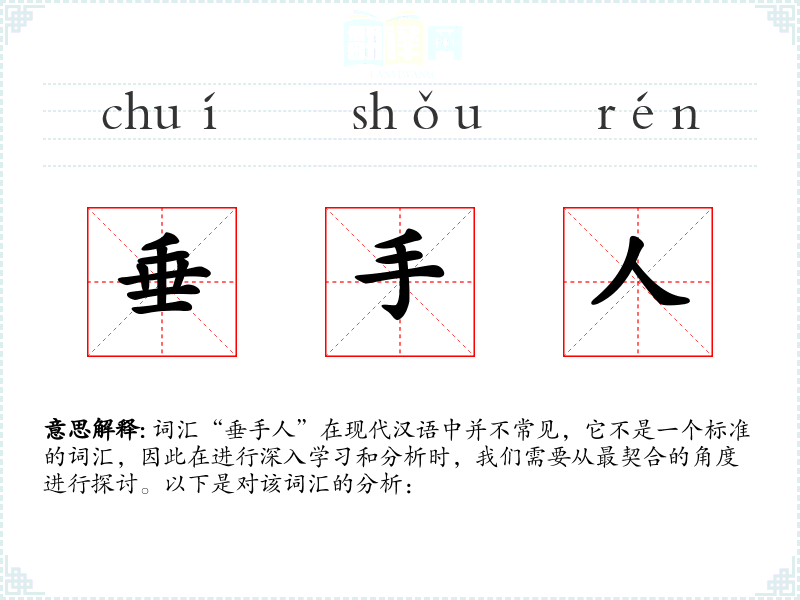 词汇“垂手人”在现代汉语中并不常见,它不是一个标准的词汇,因此在进行深入学习和分析时,我们需要从最契合的角度进行探讨。以下是对该词汇的分析: