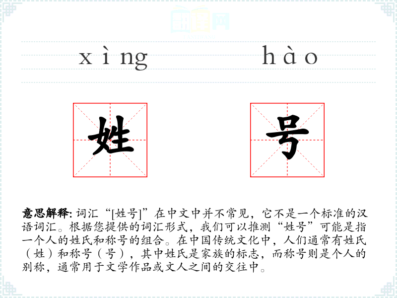 - “姓号”虽然不是一个常用词汇,但它反映了中华文化中对个人身份和文化传承的重视。在学*和研究**历史文化时,了解和正确使用姓号是很有帮助的。