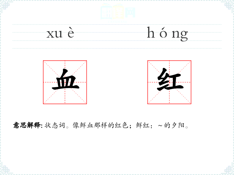 状态词。像鲜血那样的红色;鲜红:~的夕阳。