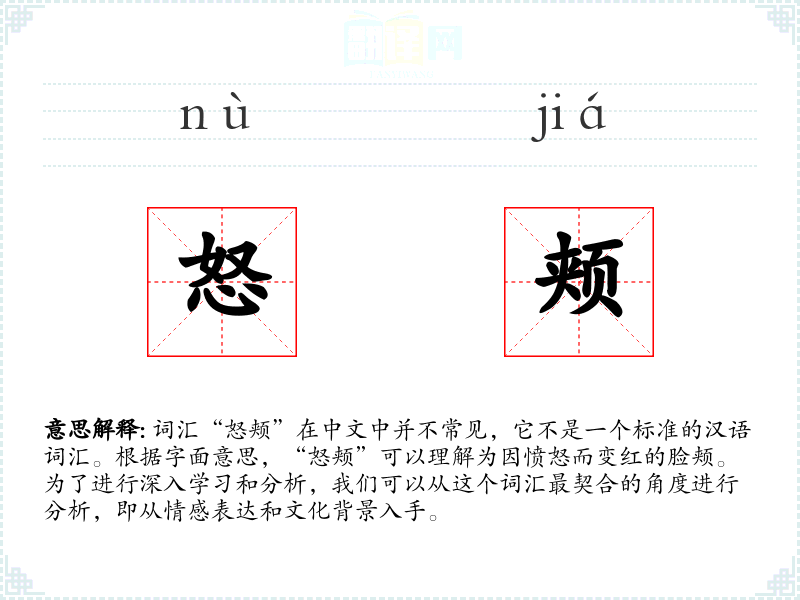 词汇“怒颊”在中文中并不常见,它不是一个标准的汉语词汇。根据字面意思,“怒颊”可以理解为因愤怒而变红的脸颊。为了进行深入学习和分析,我们可以从这个词汇最契合的角度进行分析,即从情感表达和文化背景入手。