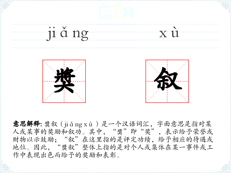 结合图片,可以想象一位获奖者在颁奖典礼上接受奖章的场景,这种视觉联想强化了“奬叙”的正面意义。听觉上,可能会联想到颁奖典礼上的掌声和赞扬声。