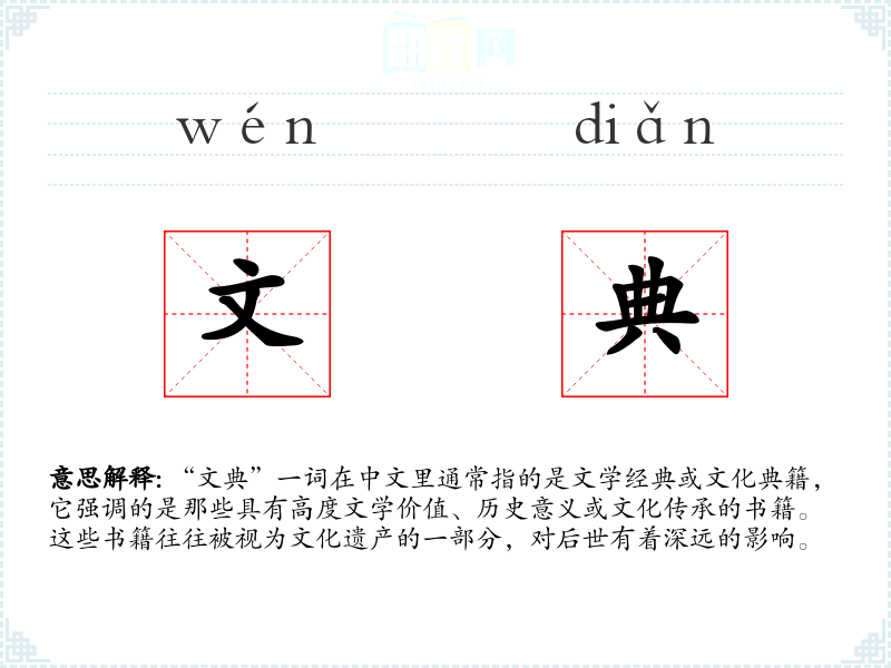“文典”一词在中文里通常指的是文学经典或文化典籍,它强调的是那些具有高度文学价值、历史意义或文化传承的书籍。这些书籍往往被视为文化遗产的一部分,对后世有着深远的影响。