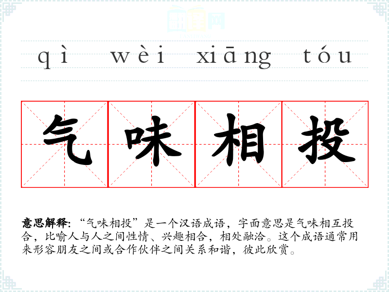 “气味相投”是一个汉语成语,字面意思是气味相互投合,比喻人与人之间性情、兴趣相合,相处融洽。这个成语通常用来形容朋友之间或合作伙伴之间关系和谐,彼此欣赏。