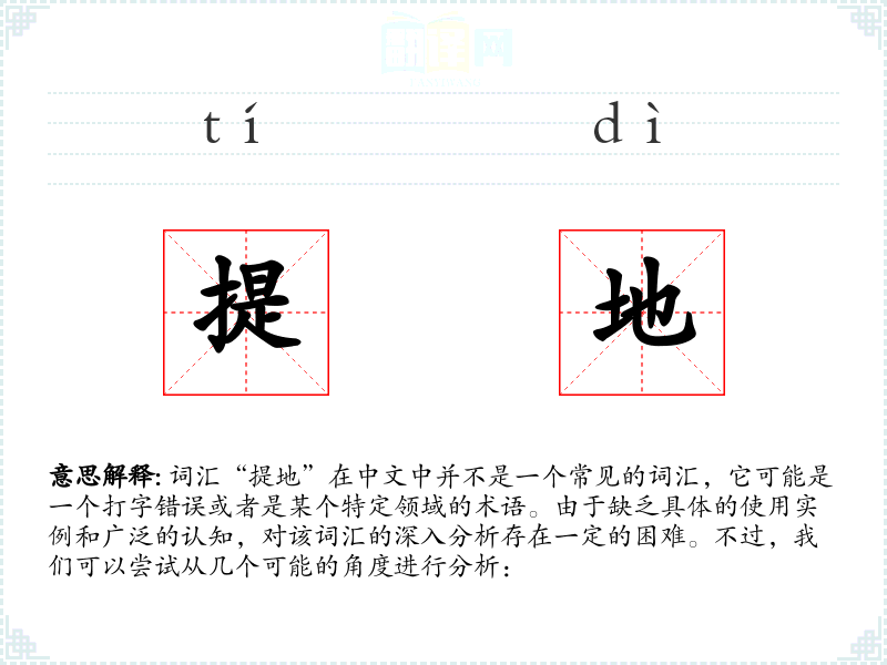 由于“提地”不是一个标准词汇,我们无法给出确切的基本定义。它可能是“提”和“地”两个字的组合,但这种组合在标准汉语中没有明确的意义。
