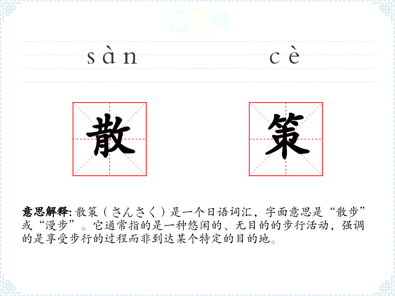 “散策”由“散る”(散开、分散)和“策”(计划、策略)组成,最初可能指的是有计划的分散活动,后来逐渐演变为指代无目的的悠闲步行。