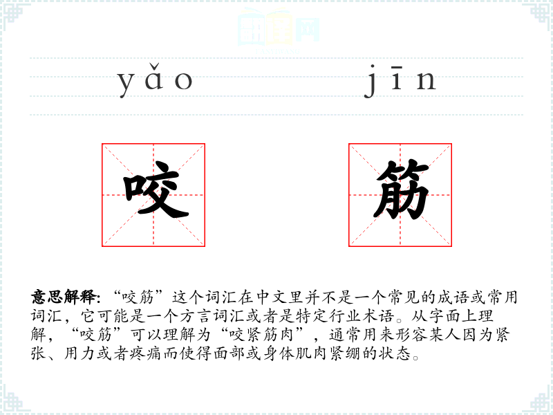 “咬筋”这个词汇在中文里并不是一个常见的成语或常用词汇,它可能是一个方言词汇或者是特定行业术语。从字面上理解,“咬筋”可以理解为“咬紧筋肉”,通常用来形容某人因为紧张、用力或者疼痛而使得面部或身体肌肉紧绷的状态。