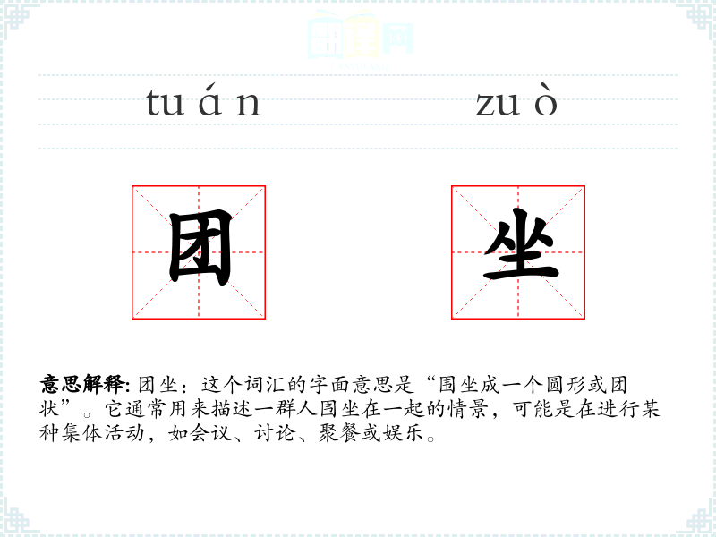 团坐:这个词汇的字面意思是“围坐成一个圆形或团状”。它通常用来描述一群人围坐在一起的情景,可能是在进行某种集体活动,如会议、讨论、聚餐或娱乐。