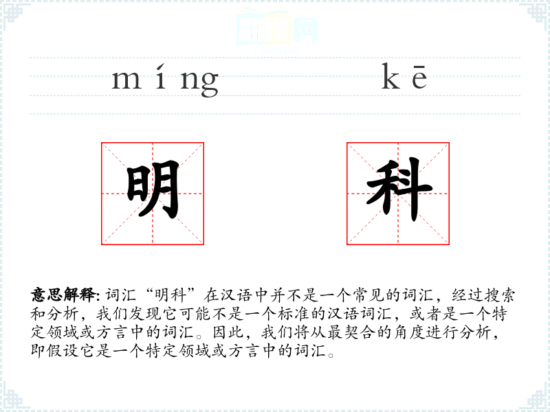 词汇“明科”在汉语中并不是一个常见的词汇,经过搜索和分析,我们发现它可能不是一个标准的汉语词汇,或者是一个特定领域或方言中的词汇。因此,我们将从最契合的角度进行分析,即假设它是一个特定领域或方言中的词汇。