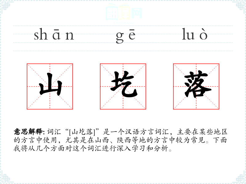 词汇“[山圪落]”是一个汉语方言词汇,主要在某些地区的方言中使用,尤其是在山西、陕西等地的方言中较为常见。下面我将从几个方面对这个词汇进行深入学习和分析。