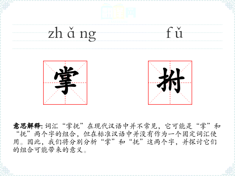 词汇“掌抚”在现代汉语中并不常见,它可能是“掌”和“抚”两个字的组合,但在标准汉语中并没有作为一个固定词汇使用。因此,我们将分别分析“掌”和“抚”这两个字,并探讨它们的组合可能带来的意义。