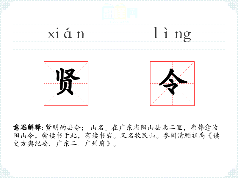 贤明的县令; 山名。在广东省阳山县北二里,唐韩愈为阳山令,尝读书于此,有读书岩。又名牧民山。参阅清顾祖禹《读史方舆纪要.广东二.广州府》。