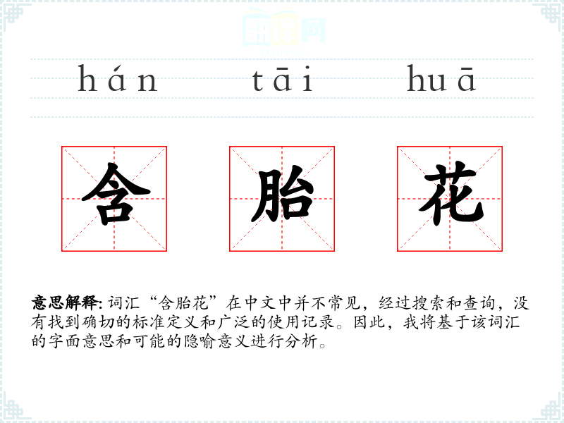 词汇“含胎花”在中文中并不常见,经过搜索和查询,没有找到确切的标准定义和广泛的使用记录。因此,我将基于该词汇的字面意思和可能的隐喻意义进行分析。