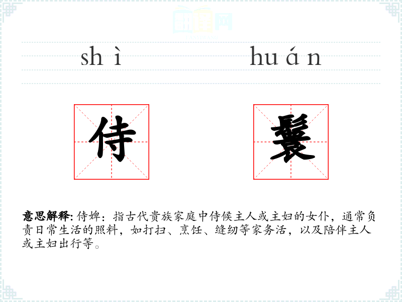 侍婢:指古代贵族家庭中侍候主人或主妇的女仆,通常负责日常生活的照料,如打扫、烹饪、缝纫等家务活,以及陪伴主人或主妇出行等。