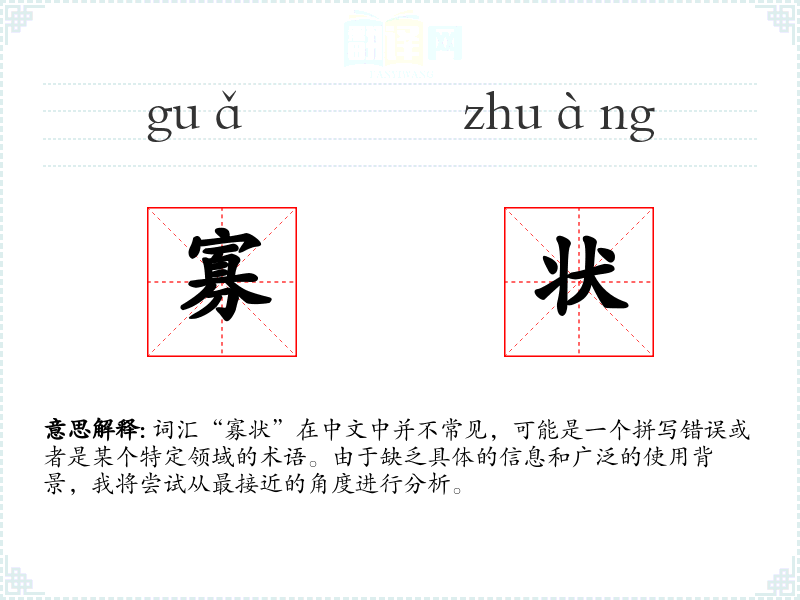 词汇“寡状”在中文中并不常见,可能是一个拼写错误或者是某个特定领域的术语。由于缺乏具体的信息和广泛的使用背景,我将尝试从最接近的角度进行分析。
