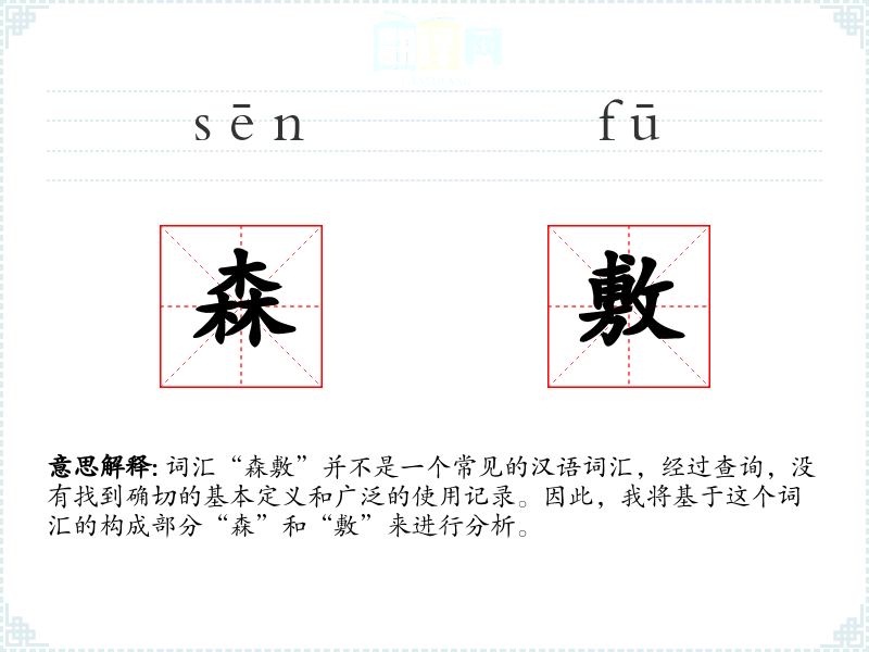 “森”和“敷”都是汉语中的基本词汇,但“森敷”作为一个组合词汇,其词源和演变不详。