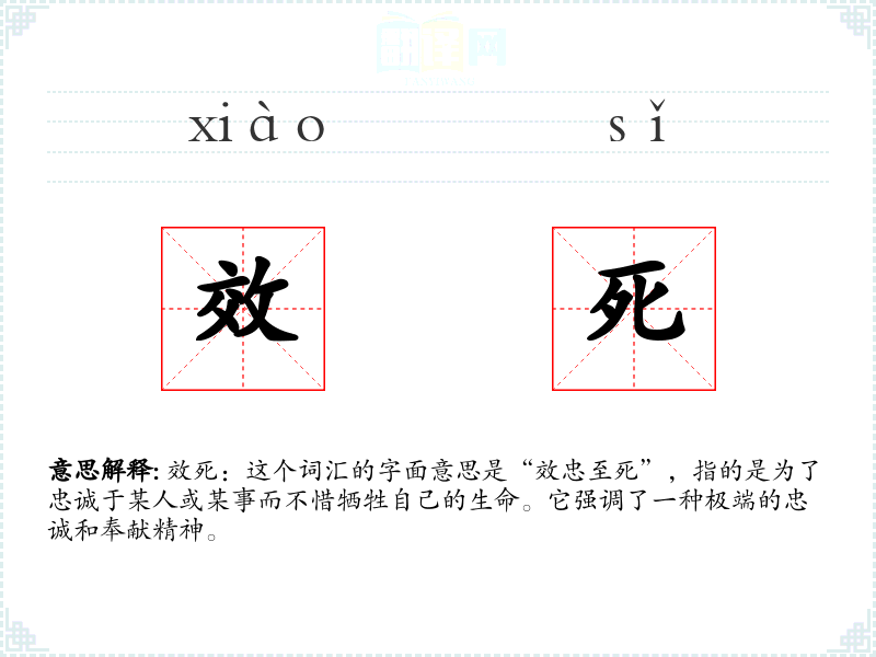 效死:这个词汇的字面意思是“效忠至死”,指的是为了忠诚于某人或某事而不惜牺牲自己的生命。它强调了一种极端的忠诚和奉献精神。