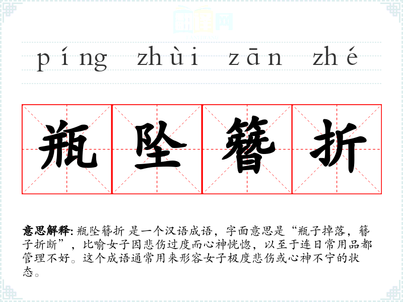 瓶坠簪折 是一个汉语成语,字面意思是“瓶子掉落,簪子折断”,比喻女子因悲伤过度而心神恍惚,以至于连日常用品都管理不好。这个成语通常用来形容女子极度悲伤或心神不宁的状态。