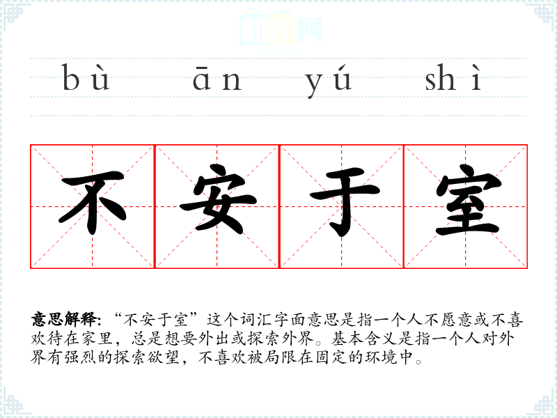 “不安于室”这个词汇字面意思是指一个人不愿意或不喜欢待在家里,总是想要外出或探索外界。基本含义是指一个人对外界有强烈的探索欲望,不喜欢被局限在固定的环境中。