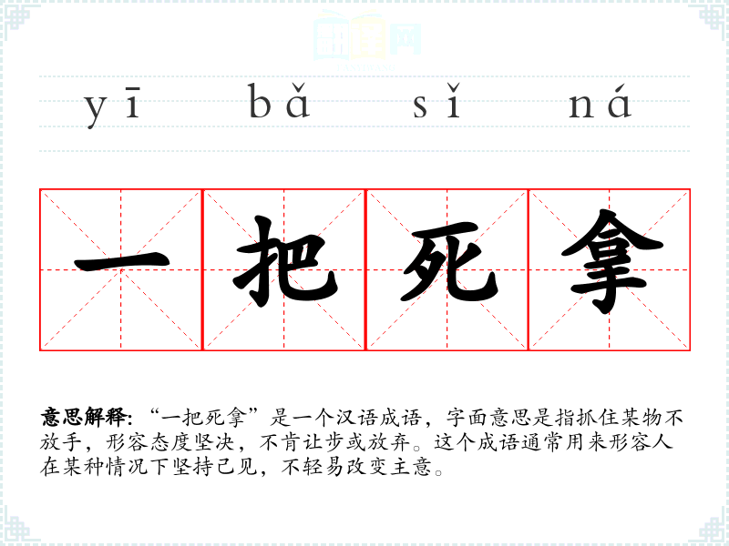 “一把死拿”是一个汉语成语,字面意思是指抓住某物不放手,形容态度坚决,不肯让步或放弃。这个成语通常用来形容人在某种情况下坚持己见,不轻易改变主意。