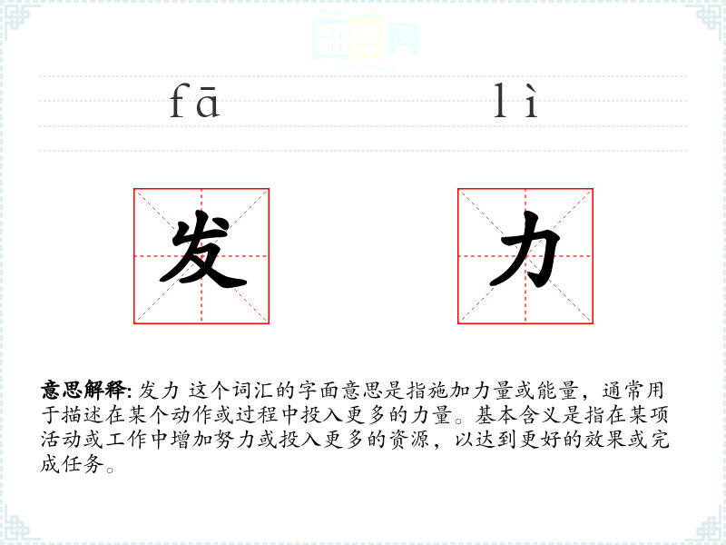 发力 这个词汇的字面意思是指施加力量或能量,通常用于描述在某个动作或过程中投入更多的力量。基本含义是指在某项活动或工作中增加努力或投入更多的资源,以达到更好的效果或完成任务。