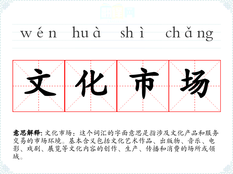 文化市场:这个词汇的字面意思是指涉及文化产品和服务交易的市场环境。基本含义包括文化艺术作品、出版物、音乐、电影、戏剧、展览等文化内容的创作、生产、传播和消费的场所或领域。