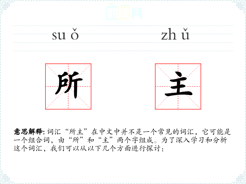 词汇“所主”在中文中并不是一个常见的词汇,它可能是一个组合词,由“所”和“主”两个字组成。为了深入学习和分析这个词汇,我们可以从以下几个方面进行探讨:
