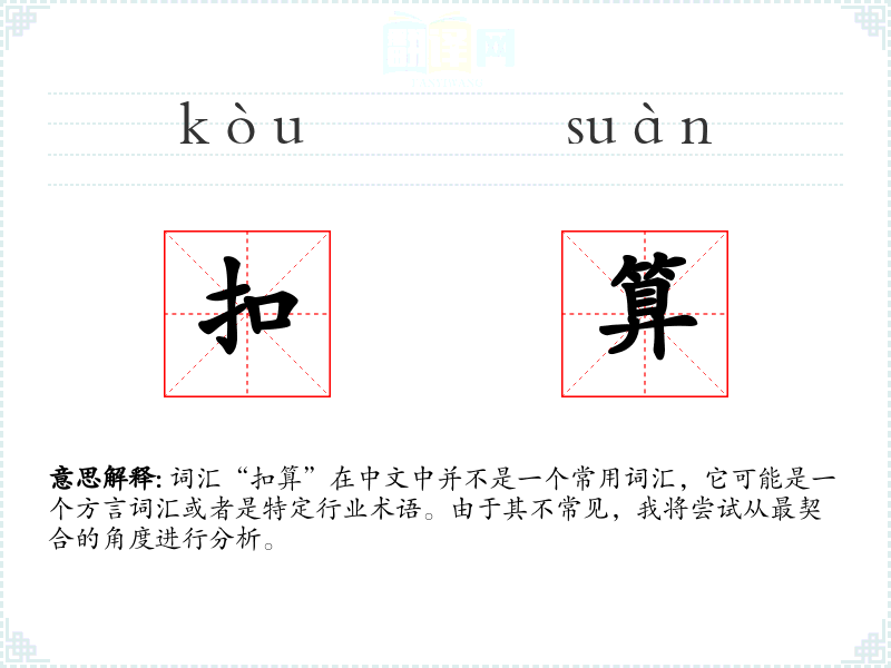 词汇“扣算”在中文中并不是一个常用词汇,它可能是一个方言词汇或者是特定行业术语。由于其不常见,我将尝试从最契合的角度进行分析。
