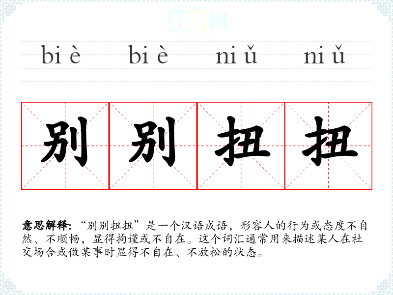 “别别扭扭”是一个汉语成语,形容人的行为或态度不自然、不顺畅,显得拘谨或不自在。这个词汇通常用来描述某人在社交场合或做某事时显得不自在、不放松的状态。