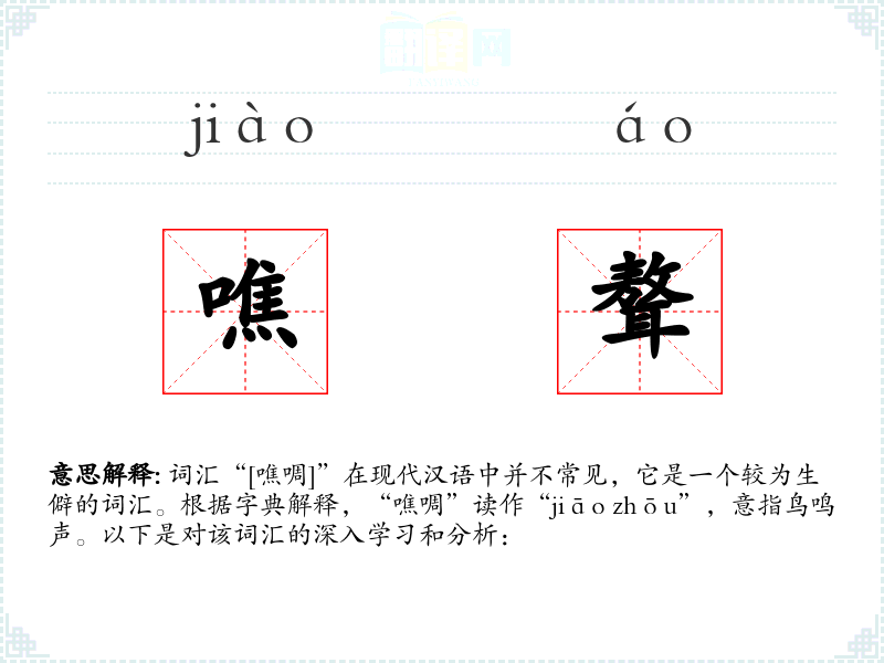 词汇“[噍啁]”在现代汉语中并不常见,它是一个较为生僻的词汇。根据字典解释,“噍啁”读作“jiāo zhōu”,意指鸟鸣声。以下是对该词汇的深入学*和分析: